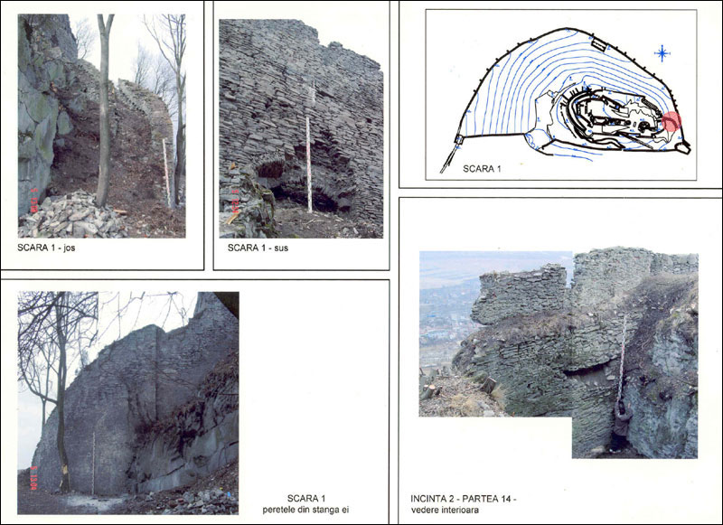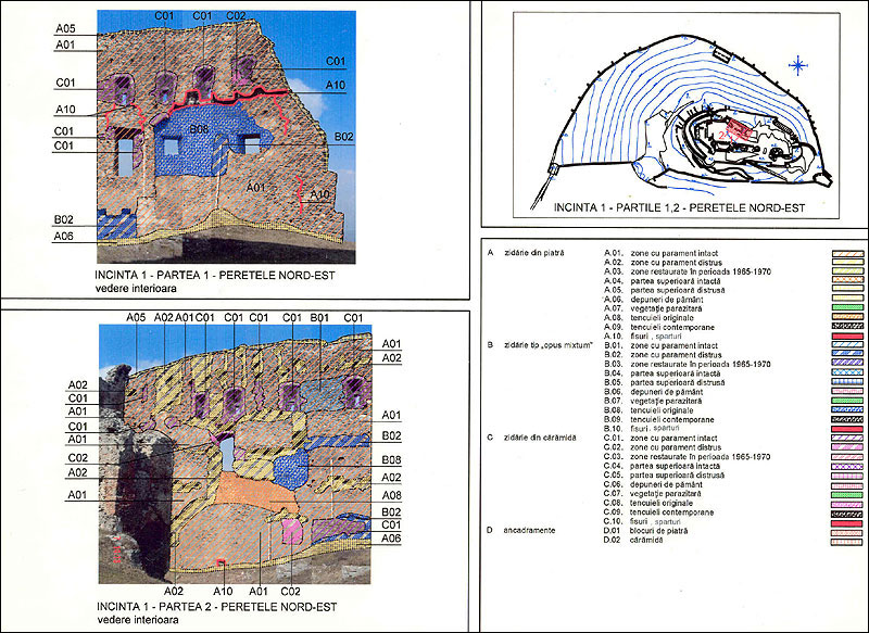 zone: - cu parament intact; - cu parament distrus; - cu parament restaurat în perioada 1965-1970; - cu partea superioară a curtinei distrusă; - cu depuneri de pământ; - cu vegetaţie parazitară; - cu tencuieli originale; - cu tencuieli contemporane; - cu fisuri; - cu spărturi. În urma acestui studiu preliminare de parament s-au